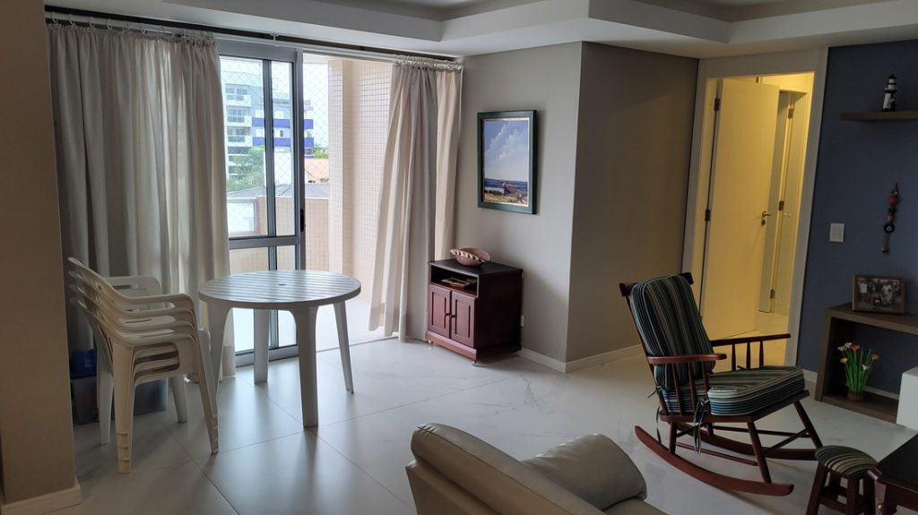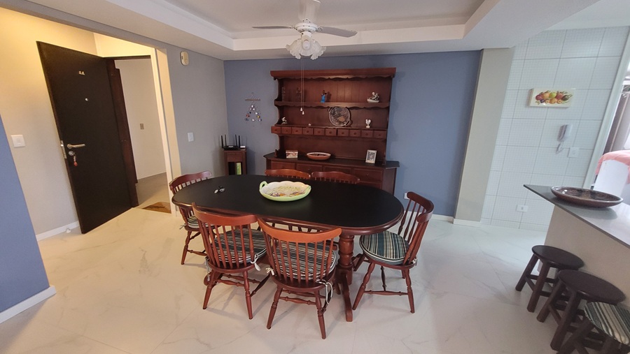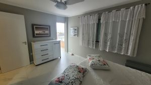 Apartamento no quarto andar do Edifício Coral com 3 quartos, sendo 1 suíte, mais 1 banheiro social completo, um 4º quarto que é dependência de empregada, funciona como pequena suíte (com banheiro completo) para atender mais uma pessoa, área de serviço e sala ampla com saída para generosa sacada com churrasqueira.