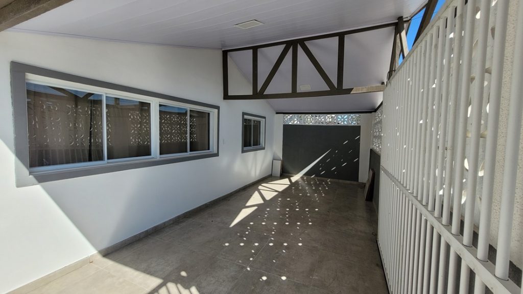 Garagem coberta na parte fontal para 2 carros e na lateral pode acomodar mais 2 veículos.